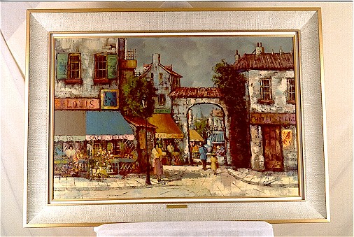 Description: Oil painting on canvas signed Laurant (Laurent). This painting depicts a sunlit Parisian street lined with cafes and restaurants. The dark clouds of a threatening summer storm lend drama to the otherwise peaceful Sunday afternoon scene. Circa 1950's. The note on the stretcher reads: Laurant: Born in Strasbourg 1910, attended the academy of Beaux-Arts in Paris and was drawn into the circle of impressionists. At the beginning of his career he did quite a variety of subjects in this style. Later on he concentrated on the Parisian street scene with great success. In this particular subject he is well known. Stretcher is stamped: ANCO INC. Glendale NY. Dimensions: 36.5" (91 cm.) x 24.5" (61 cm). Condition: Excellent condition. Asking Price: